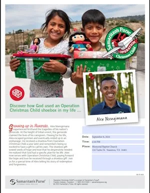 Join together to hear all the updates on this years Operation Christmas Child Samaritans Purse Shoebox drive.